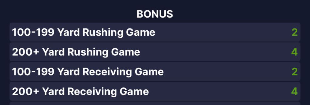 | 100 – 199 Combined Rush + Rec Yards | 2 Points |