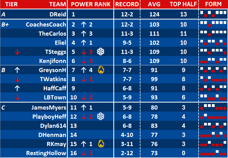 Obviously power rankings are mostly based on a team’s personnel. But there are several other factors that are weighted when determining the rankings, such as: a manager’s ability to set lineups (historically), a manager’s ability to navigate the waiver wire (historically), and a team’s perceived luck.